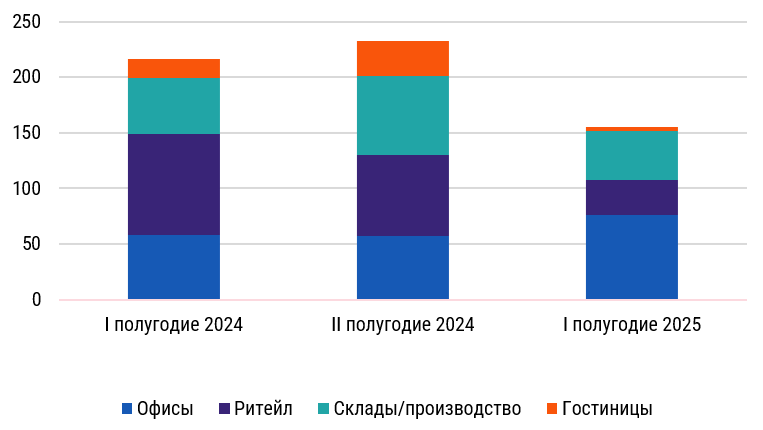 Инвестиции в недвижимость в первом полугодии 2025 г. продолжили сокращаться во всех сегментах коммерческой недвижимости. Исключением стал офисный сегмент, в котором значительный объем пришелся на обратный выкуп крупного офисного портфеля.