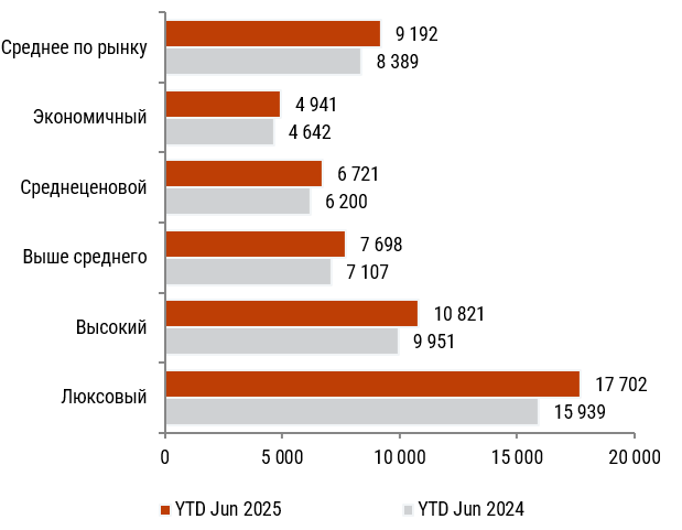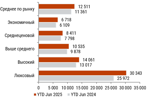 Хотя темпы прироста показателя Средней цены на номер для Рынка остались двузначными (+10,1% относительно 1 пол. 2024 г.), это стало возможным лишь за счет динамичного прироста тарифов в отелях Люксового сегмента (+16,8%). Остальные ценовые сегменты продолжают расти существенно медленнее (в среднем, на 8,1%), темпами, близкими к официальной инфляции или чуть выше нее.